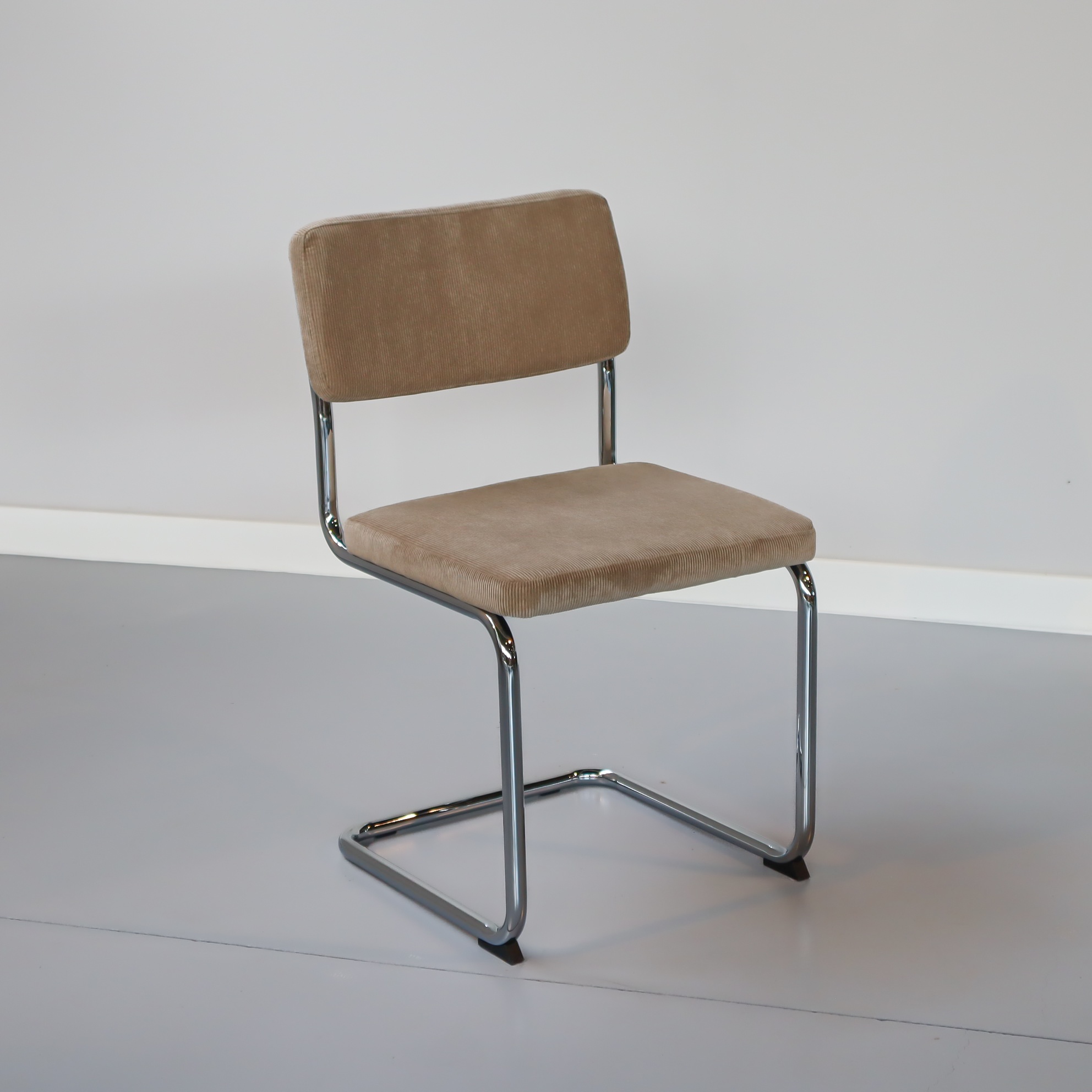 De Julia eetkamerstoel in beige straalt rust en warmte uit. De zachte ribstof in natuurlijke tint gecombineerd met het chroom onderstel zorgt voor een moderne, maar huiselijke uitstraling. Ook is deze stoel een klassieker en zal het niet snel uit de mode raken. Perfect voor wie comfort en stijl belangrijk vindt aan de eettafel.