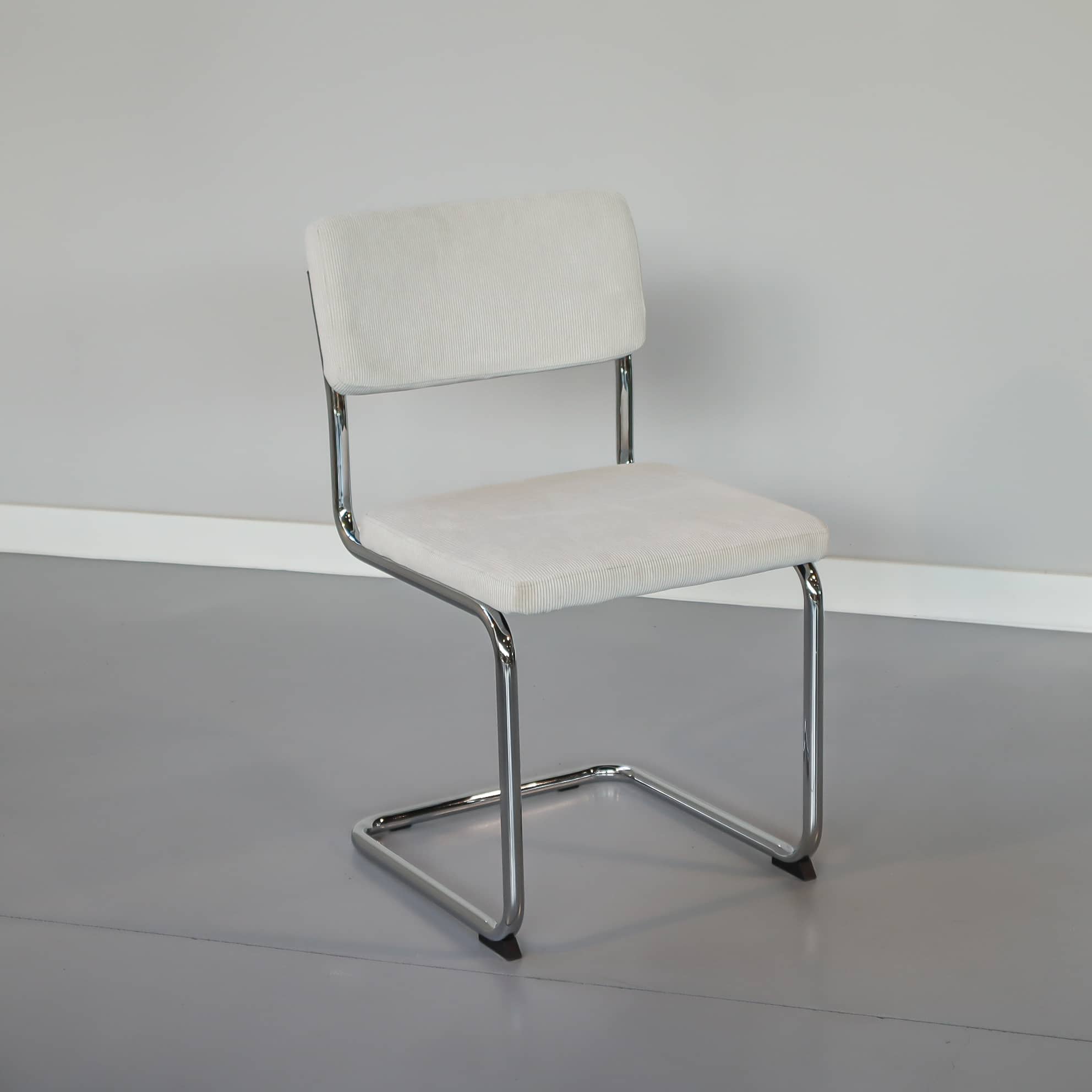 De Julia eetkamerstoel in wit is fris, modern en comfortabel. De combinatie van zachte ribstof en een glanzend chroom onderstel geeft de stoel een luxe uitstraling. Dankzij de slanke vorm en neutrale kleur past Julia in bijna elk interieur, van strak modern tot warm en sfeervol. Dit model bestaat al jaren en zal je niet snel op uitgekeken raken.