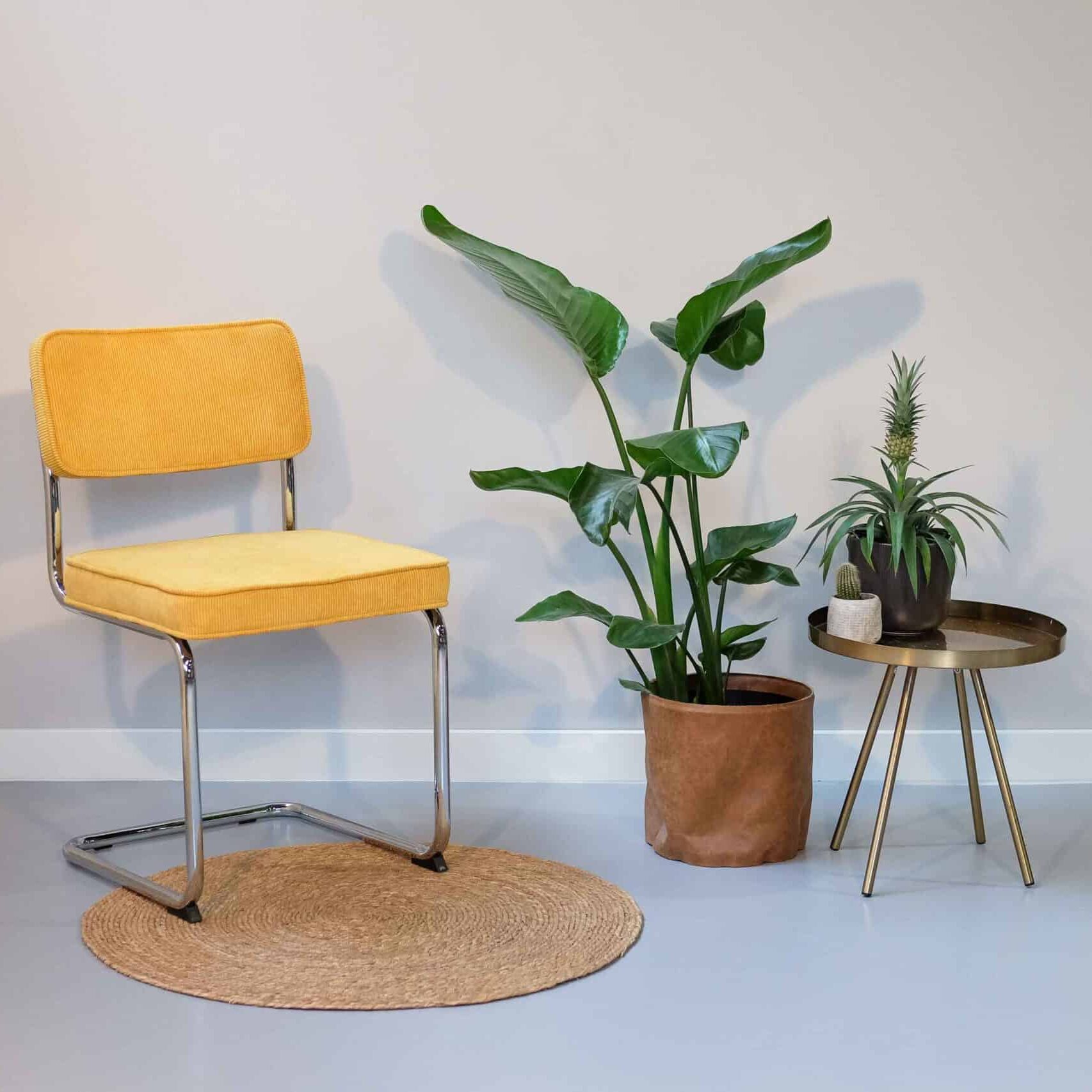 De Olivia eetkamerstoel in ribstof geel zorgt direct voor een zonnige sfeer aan tafel. De frisse gele kleur brengt licht en vrolijkheid in je interieur en geeft een speelse twist aan een modern of retro eethoek. Een opvallend accent dat ook nog eens heerlijk zit. Combineer hem ook eens met een neutralere kleur zoal antraciet of groen.