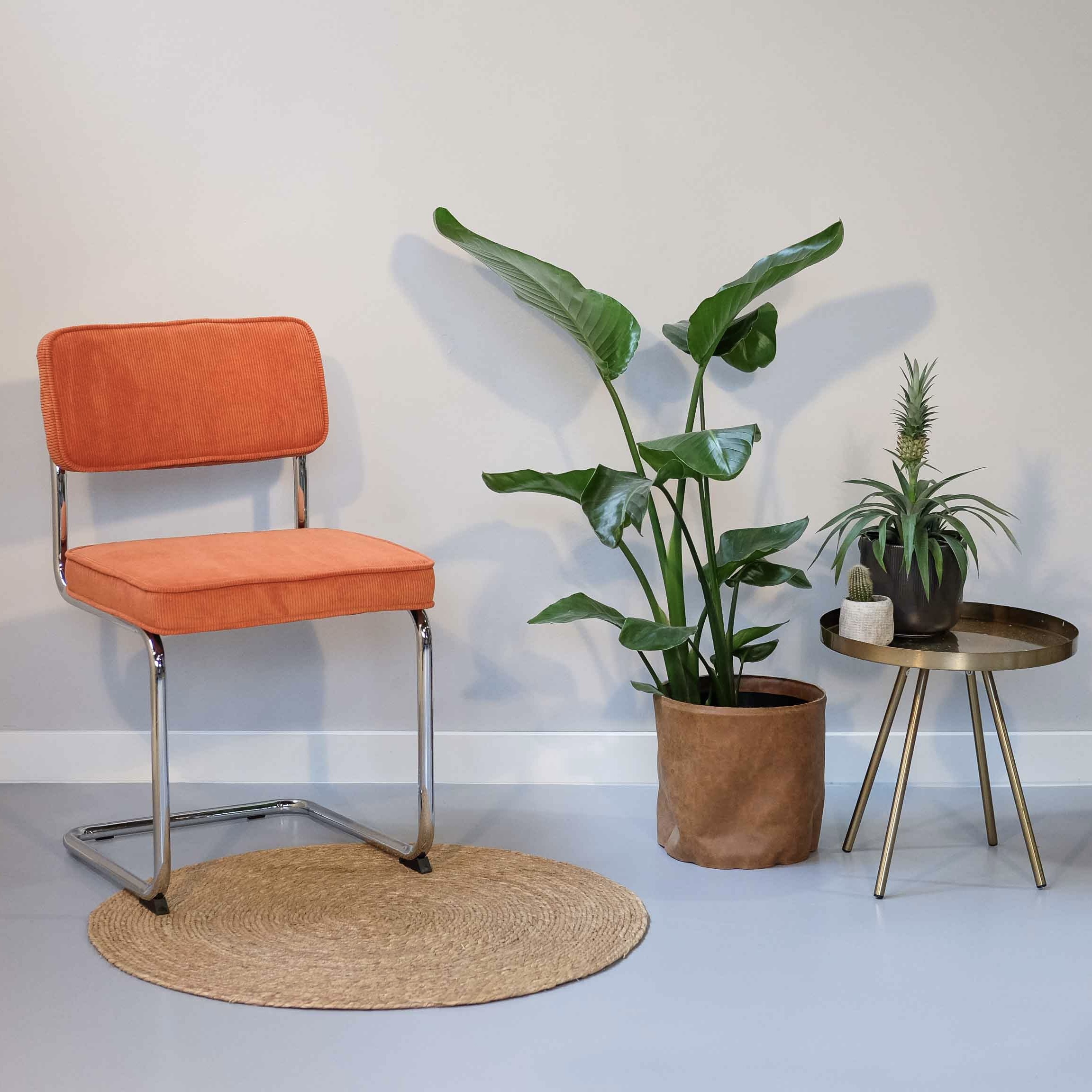 De Olivia eetkamerstoel in ribstof oranje brengt warmte en energie in je interieur. De levendige kleur in combinatie met het chroom onderstel geeft deze stoel een speelse, retro uitstraling. Een echte blikvanger aan tafel die ook nog eens heerlijk zit door zijn verende frame. Combineer hem ook vooral met zijn andere kleuren zoals geel en groen.