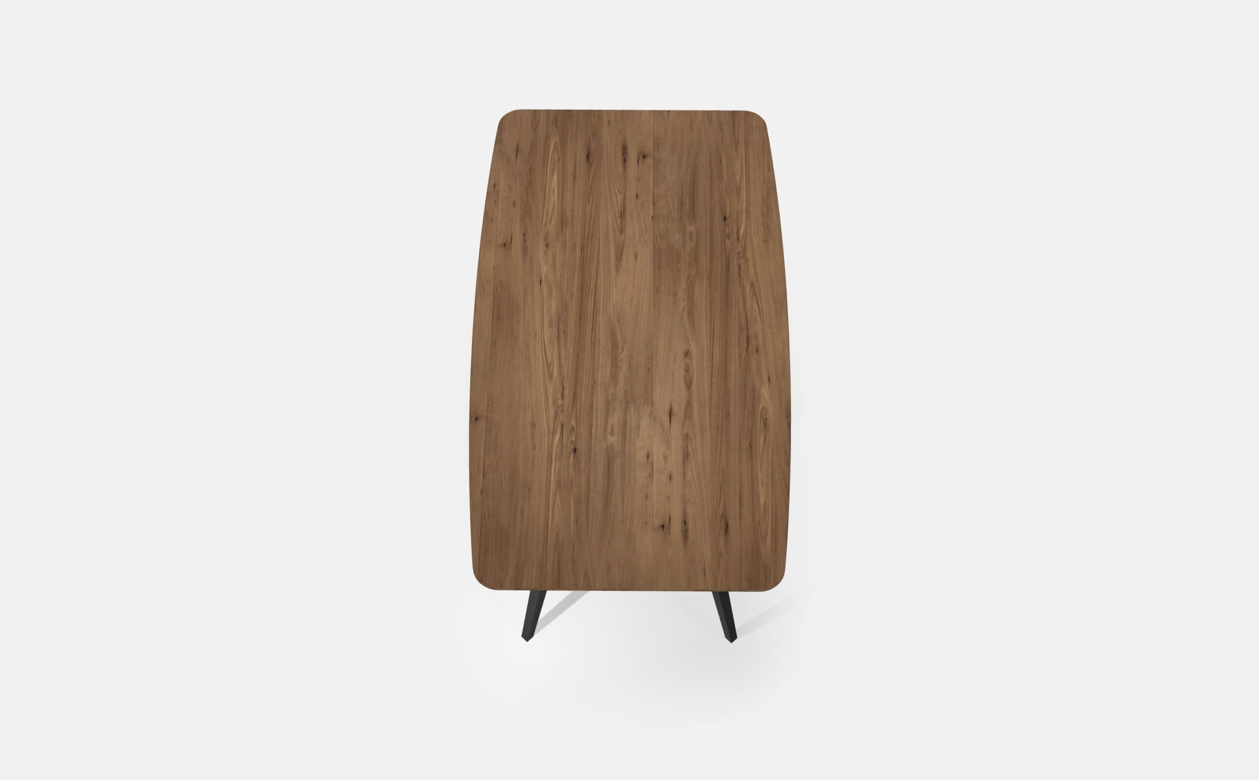 Het massief notenhouten blad van 3 cm dik straalt luxe en vakmanschap uit. Notenhout staat bekend om zijn warme, diepe kleur en verfijnde houttekening, waardoor iedere tafel uniek is. Het blad is afgewerkt met Rubio Monocoat Pure, een natuurlijke olie die het hout optimaal beschermt en de natuurlijke uitstraling versterkt.