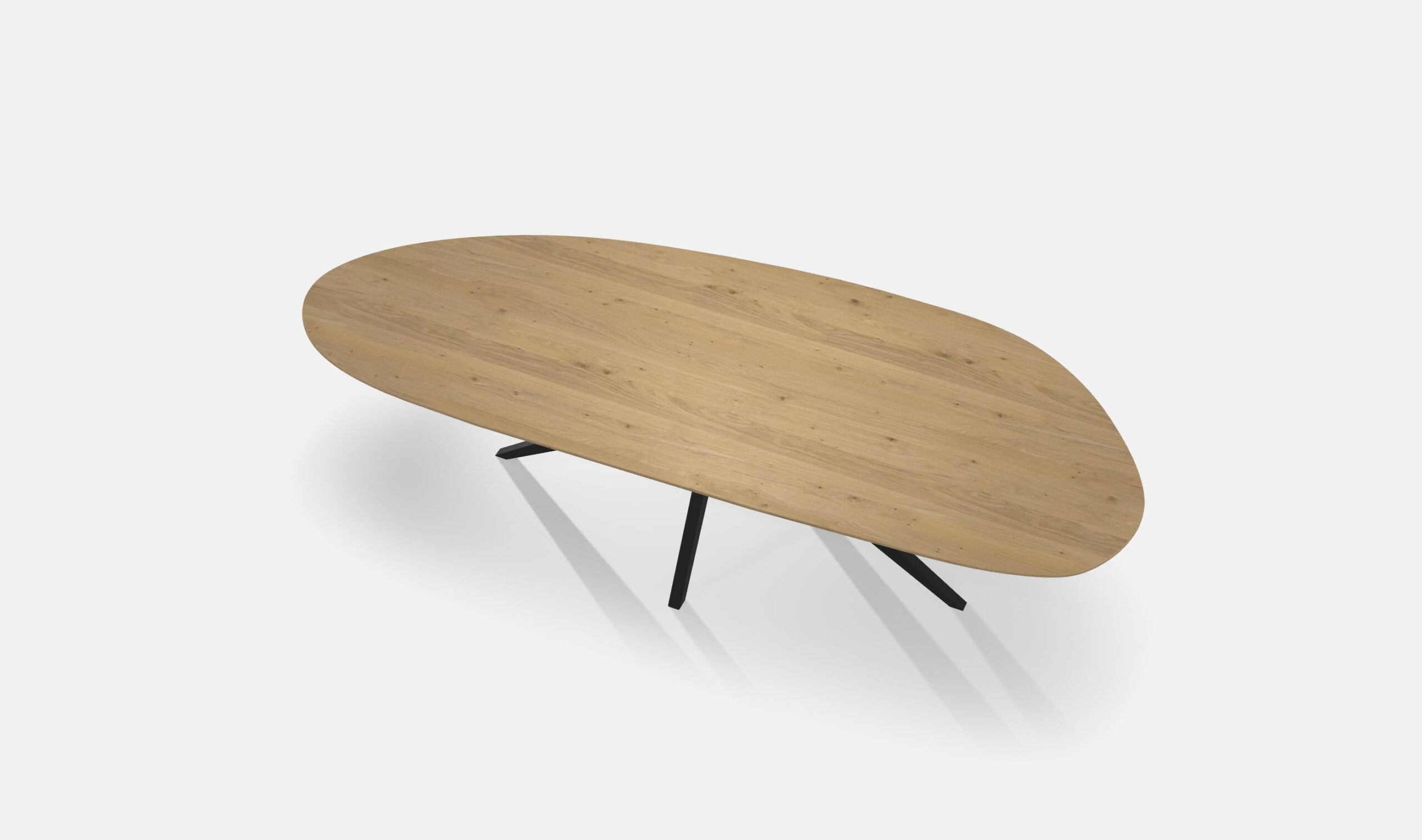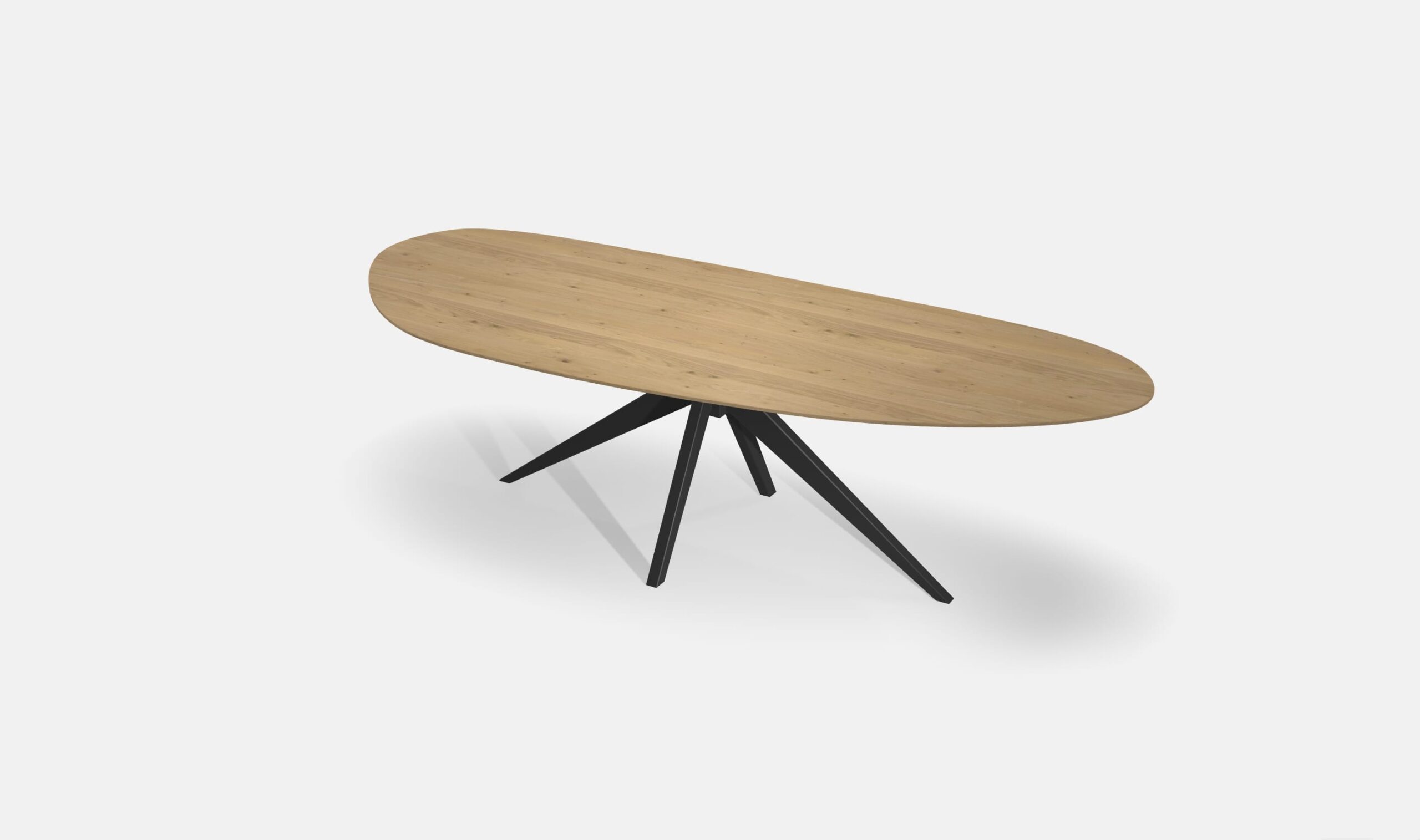 Het massief eiken blad van 3 cm dik straalt kwaliteit en duurzaamheid uit. Eikenhout is sterk, tijdloos en perfect voor dagelijks gebruik. Het blad is afgewerkt met Rubio Monocoat Naturel, een natuurlijke olie die het hout beschermt tegen vlekken en slijtage, terwijl de prachtige houttekening volledig tot zijn recht komt. Deze afwerking zorgt ervoor dat je tafel jarenlang mooi blijft met minimaal onderhoud.