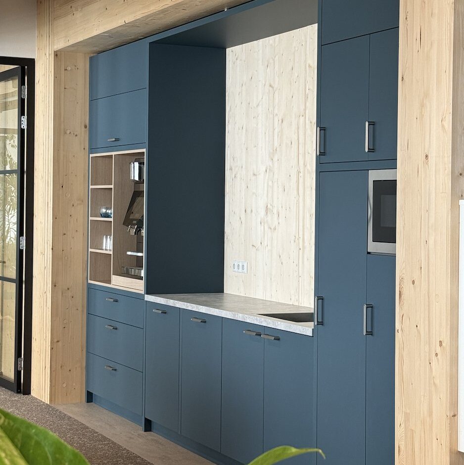 De klant heeft gekozen voor luxe Fenix fronten, dit is decor Blu Shaba. Een prachtige blauwe kleur die goed past bij de identiteit van het bedrijf
