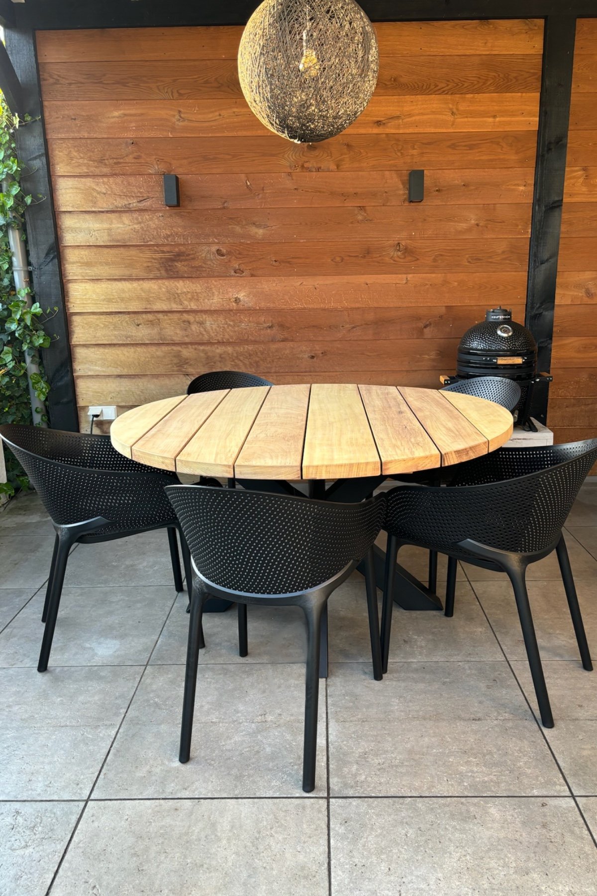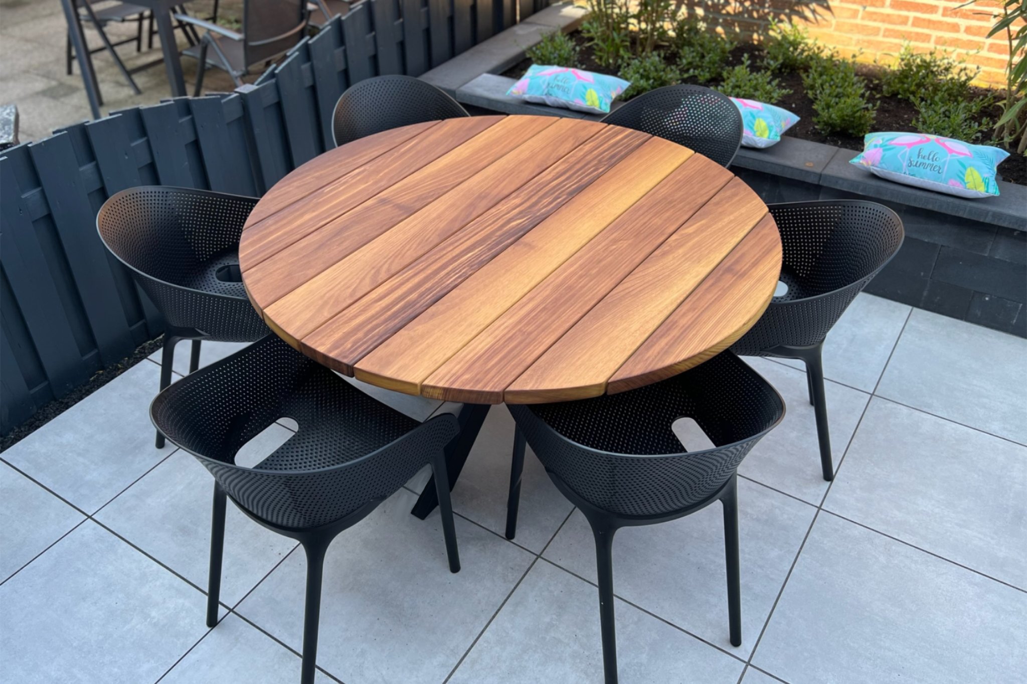 Wil je comfortabel en stijlvol buiten eten met 6 personen? Dan is deze ronde Iroko tuintafel van 150 cm een prachtige keuze. Het sterke, duurzame Iroko hardhout heeft een warme uitstraling en is goed bestand tegen weersinvloeden. De ronde vorm zorgt voor een gezellige opstelling waarbij iedereen makkelijk met elkaar in contact staat. De poten zijn gemaakt van verzinkt en gepoedercoat staal, een tafel dus voor de lange termijn. Kies tussen het Senna of Ava model en creëer zo jouw ideale ronde tuinset.