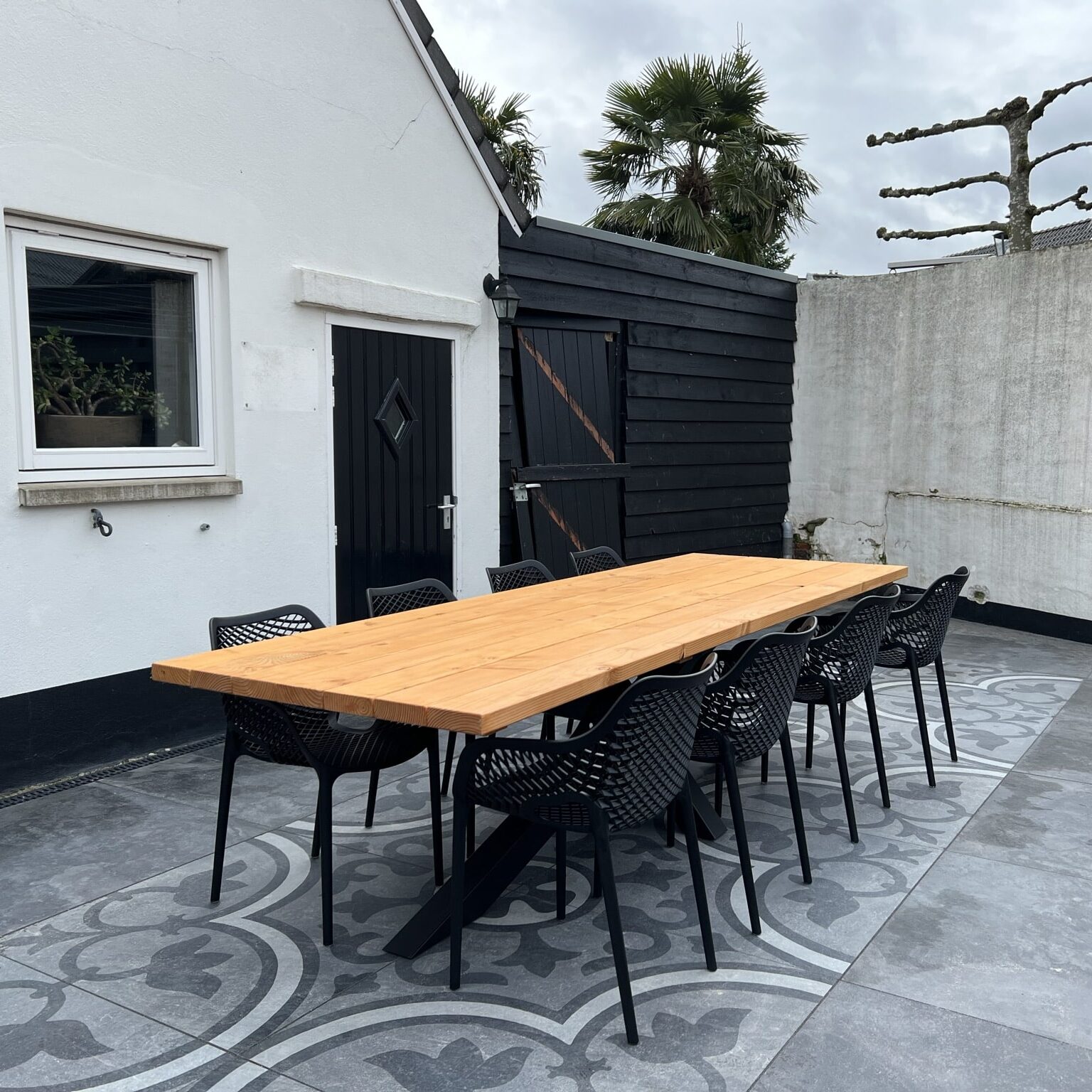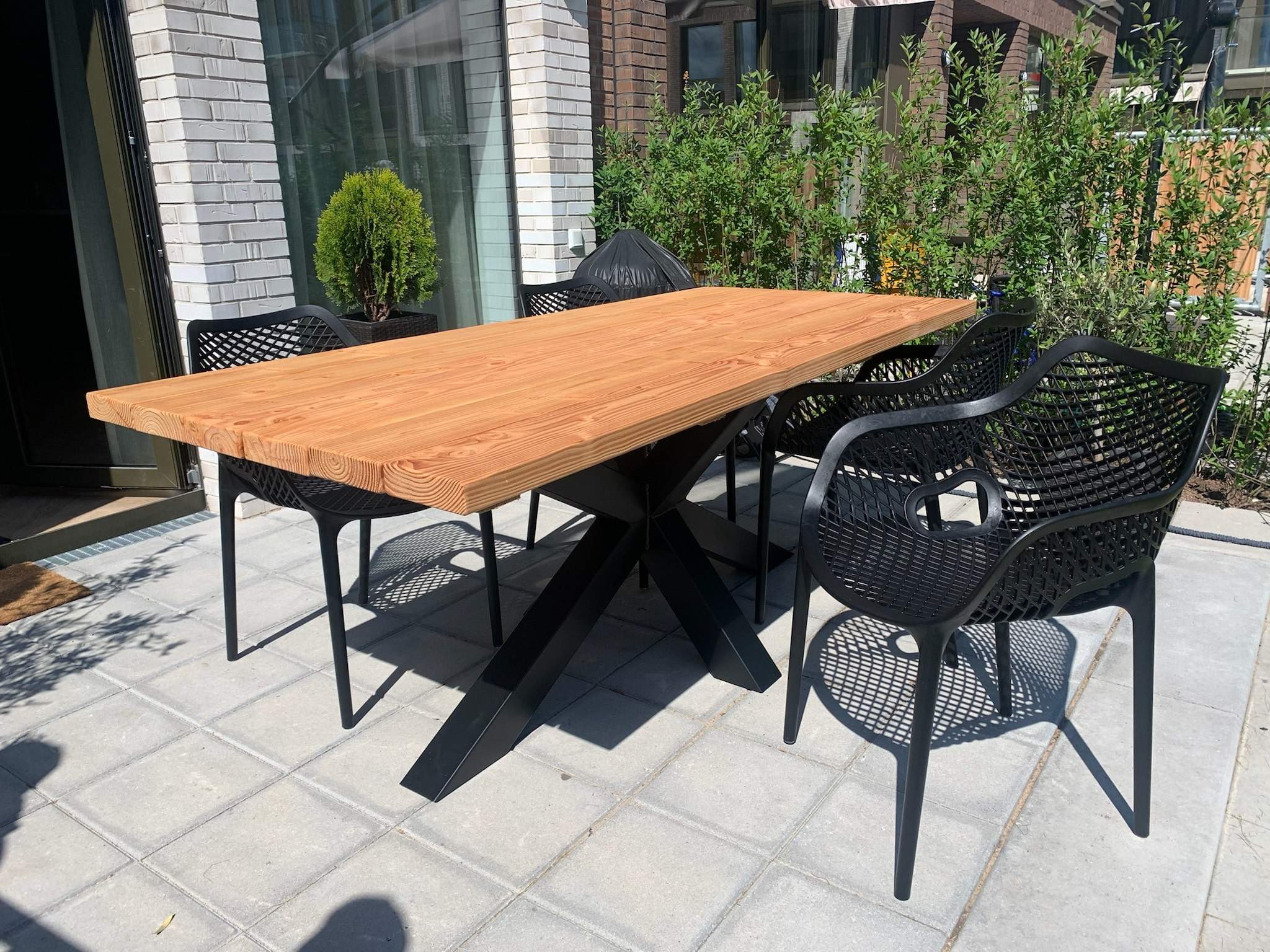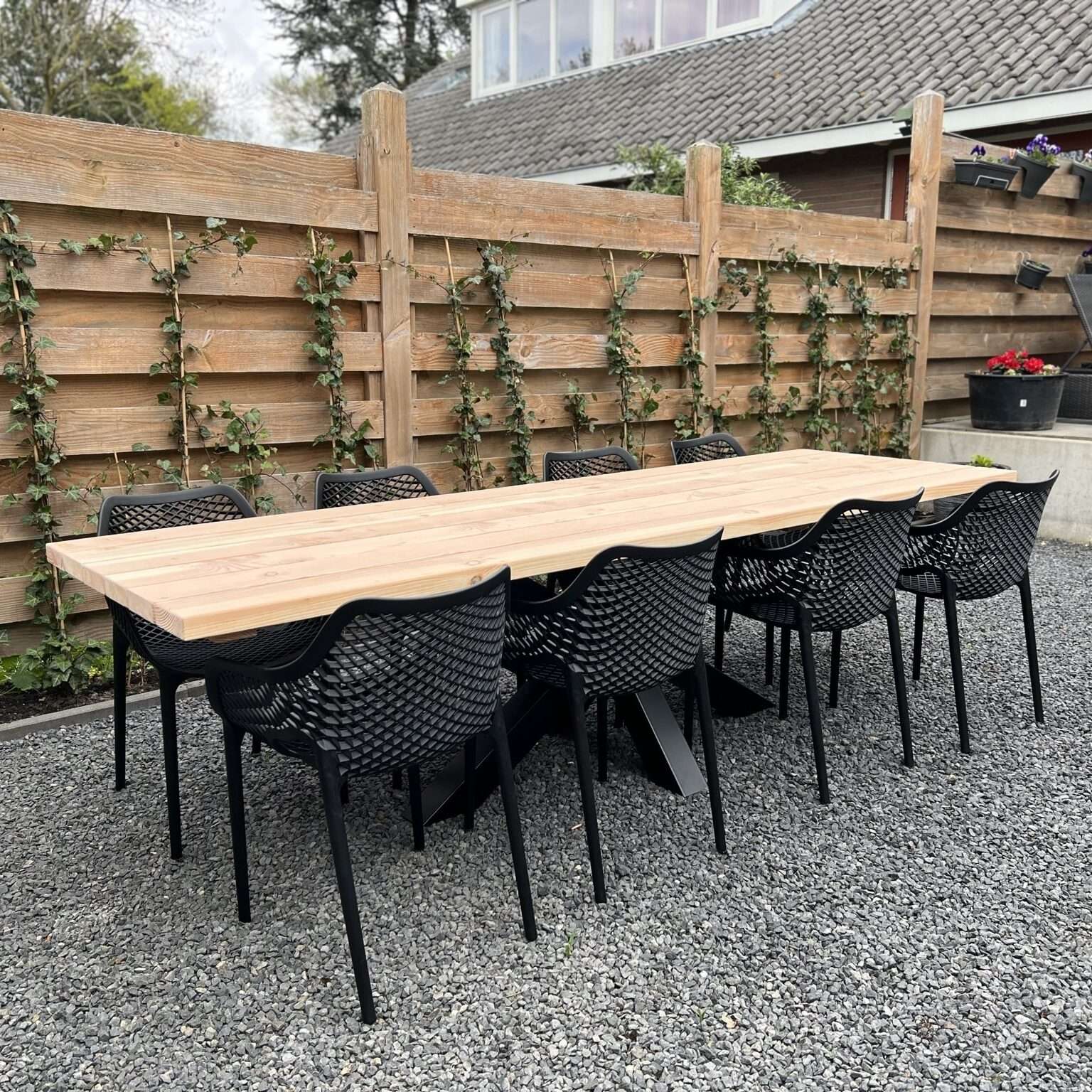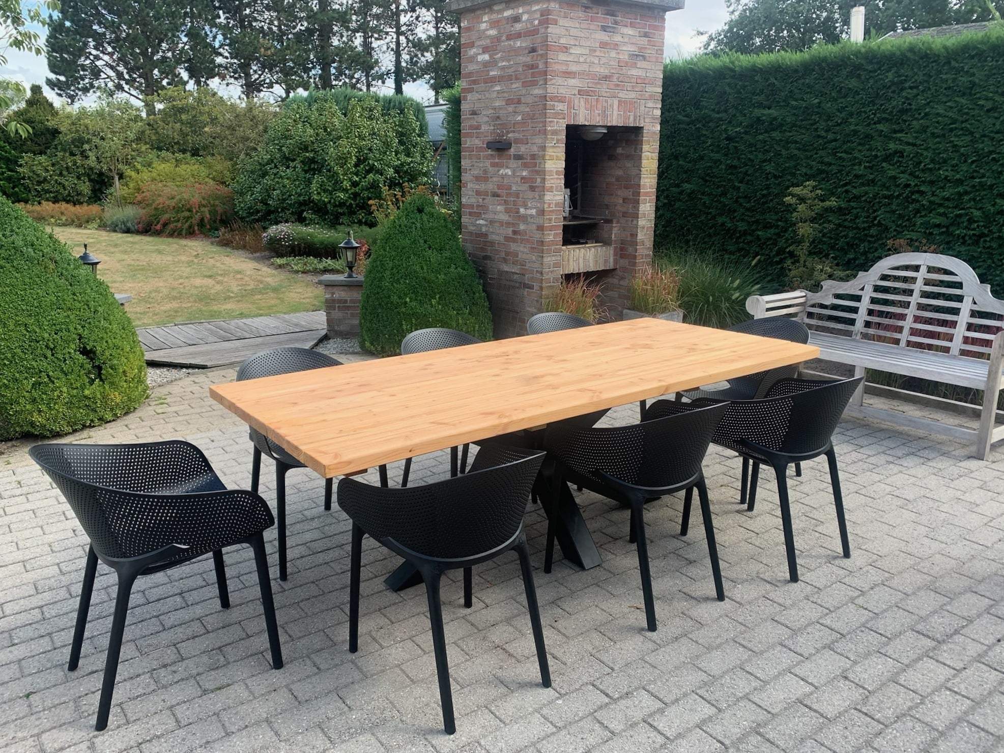 Deze rechthoekige tuintafel van Douglas hout met Matrix poot is een opvallende en praktische keuze voor buiten. Het warme, levendige houtblad rust op een robuust stalen middenpoot in kruisvorm. Dankzij deze centrale positie heb je rondom de tafel veel beenruimte en kun je stoelen flexibel plaatsen, ideaal voor grotere gezelschappen of wanneer je graag schuift met zitplekken. De Matrix poot geeft de tafel bovendien een stoere, eigentijdse uitstraling die perfect past in een moderne tuin.