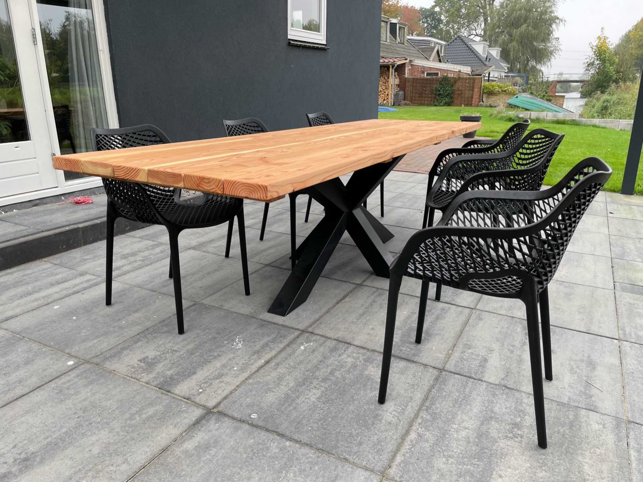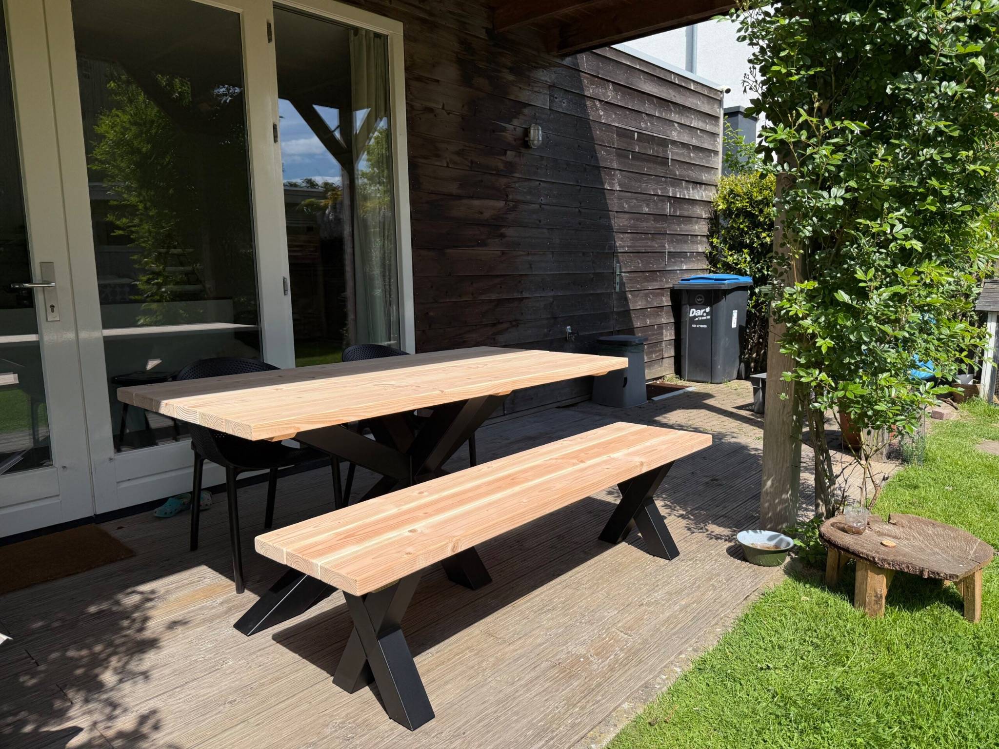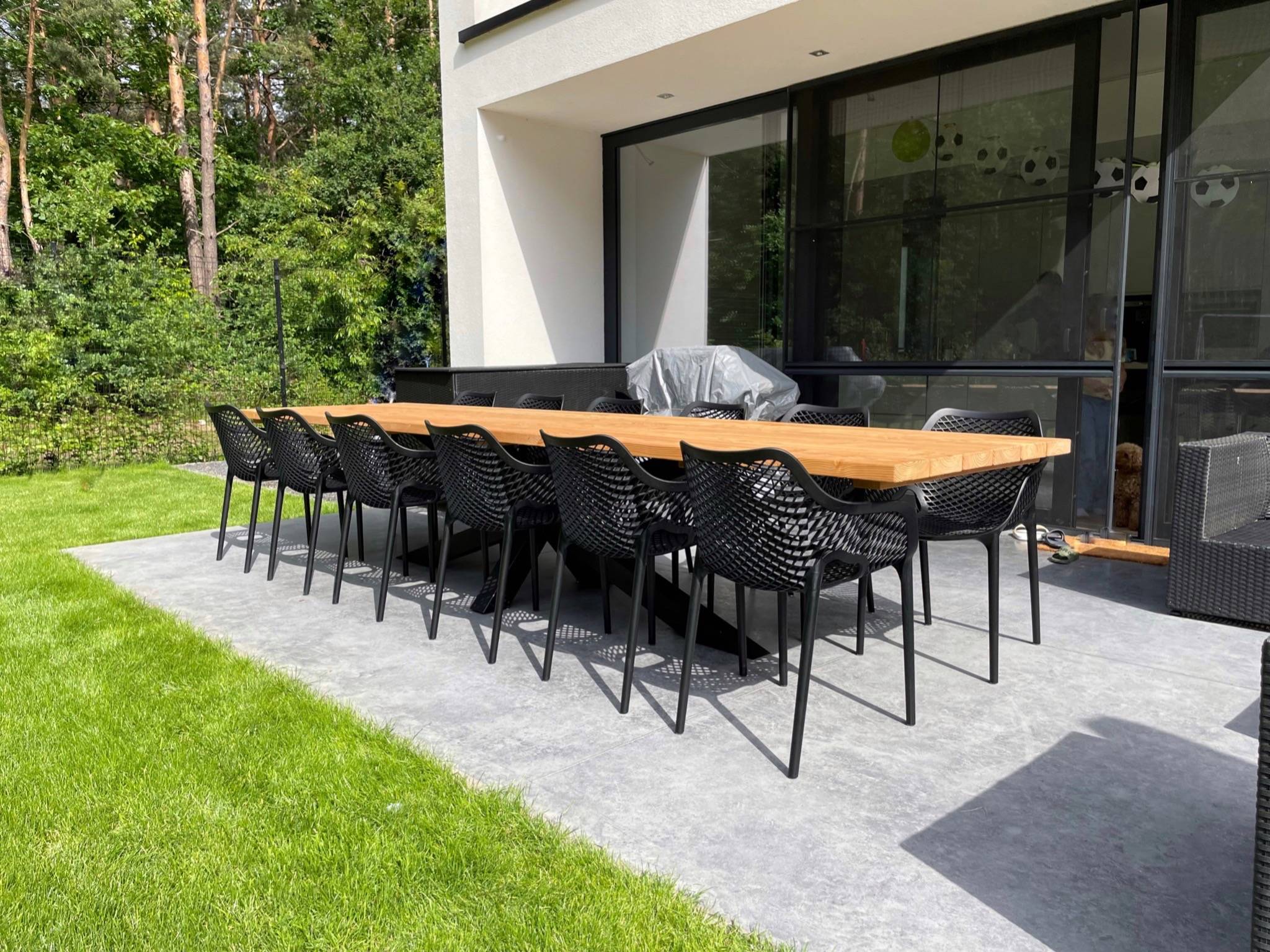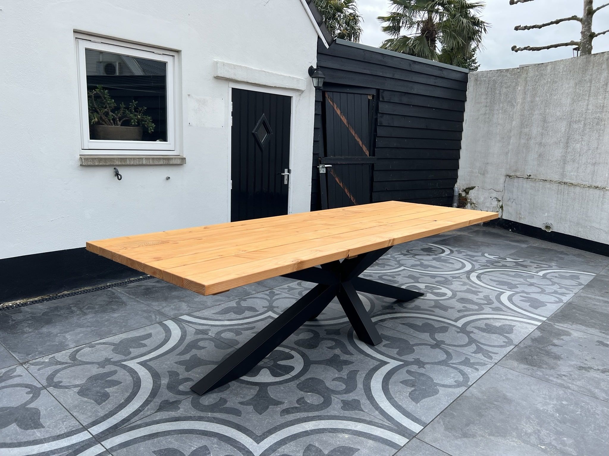 Deze rechthoekige tuintafel van Douglas hout met Matrix poot is een opvallende en praktische keuze voor buiten. Het warme, levendige houtblad rust op een robuust stalen middenpoot in kruisvorm. Dankzij deze centrale positie heb je rondom de tafel veel beenruimte en kun je stoelen flexibel plaatsen, ideaal voor grotere gezelschappen of wanneer je graag schuift met zitplekken. De Matrix poot geeft de tafel bovendien een stoere, eigentijdse uitstraling die perfect past in een moderne tuin.