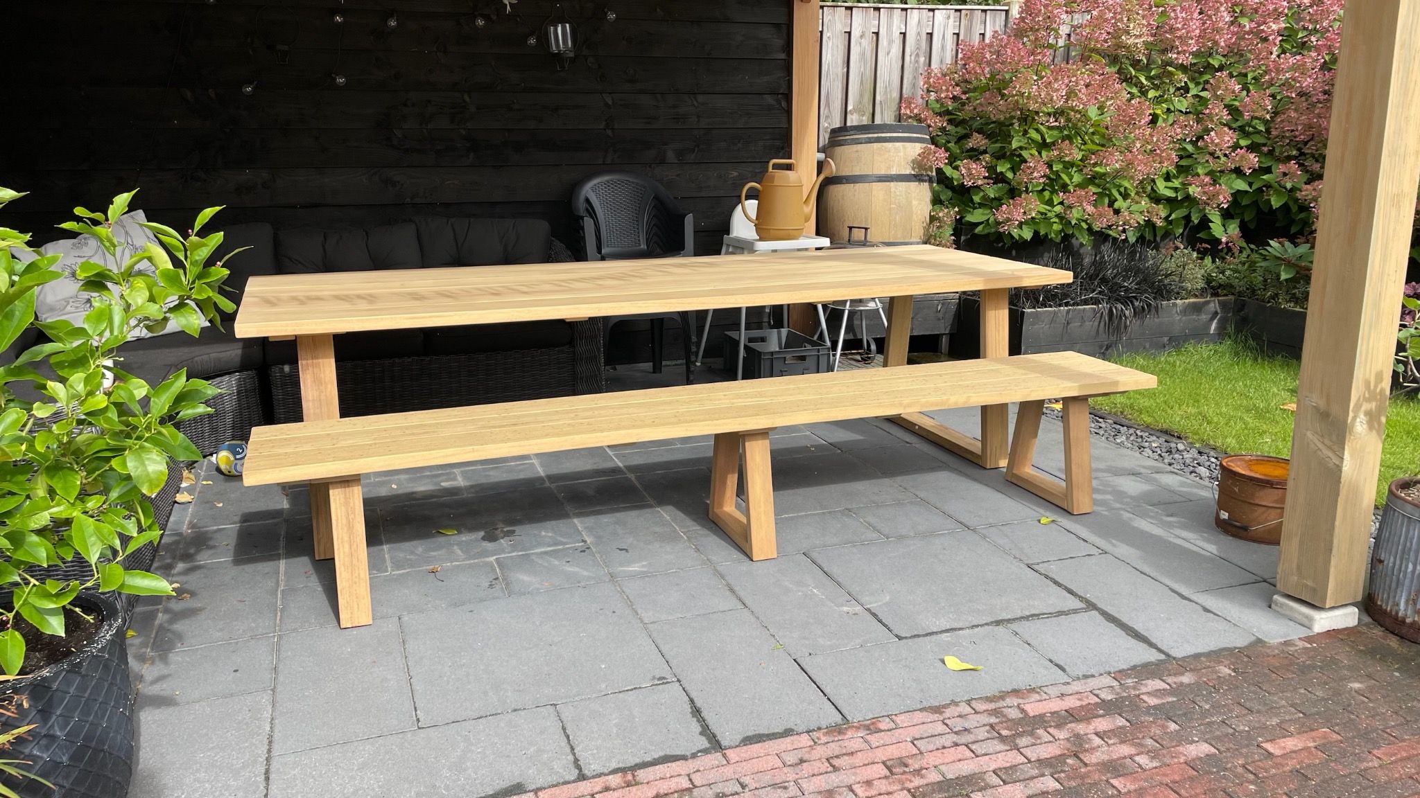 • De balken van de Iroko tafels bestaan uit verschillende maar symmetrische breedtes