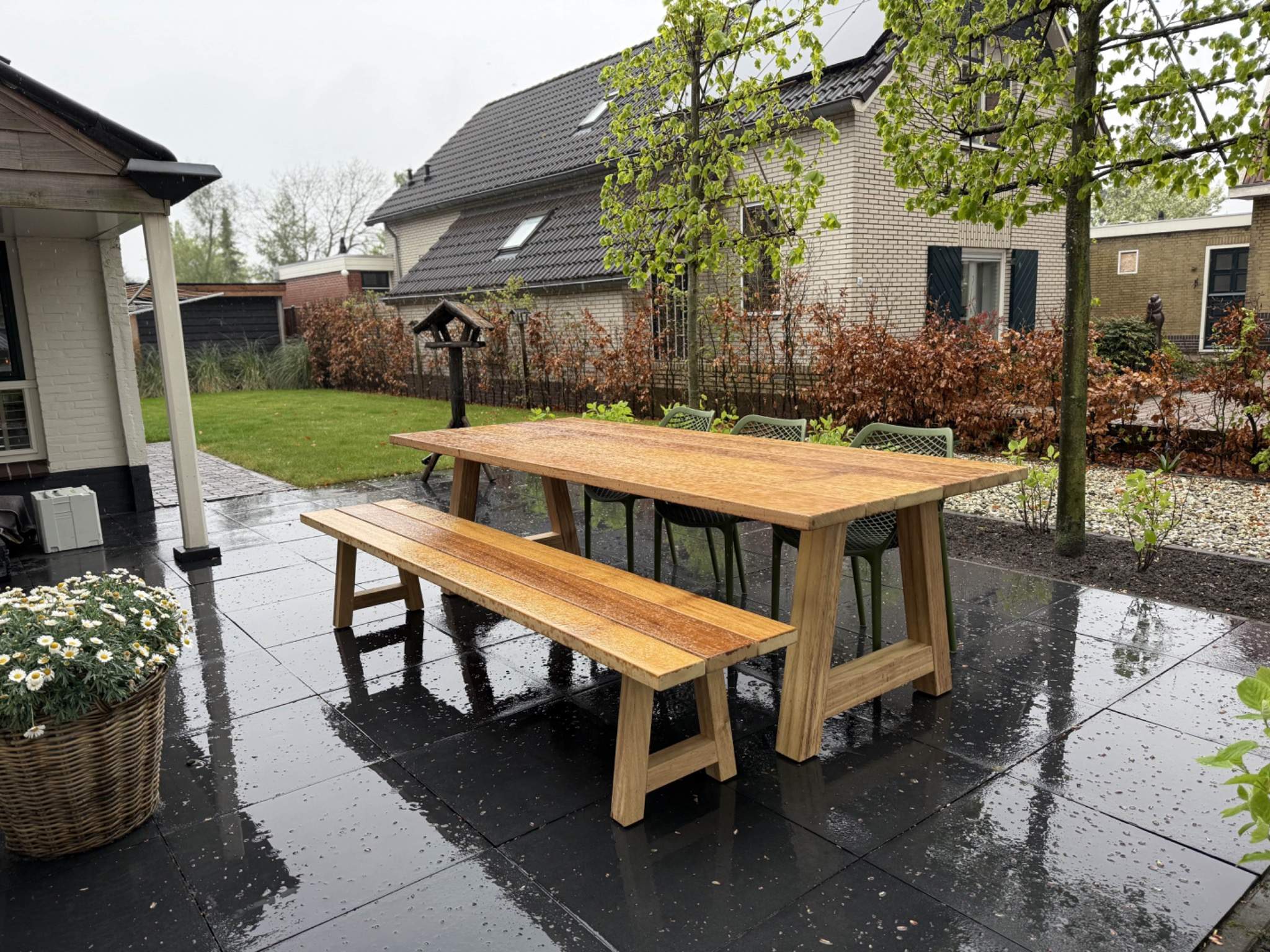 De combinatie van een Iroko hardhouten tuintafel met een bijpassende tuinbank en stalen onderstellen zorgt voor een gezellig en verfijnd geheel. De warme, goudbruine kleur van het hout komt prachtig tot zijn recht in contrast met het matzwarte staal. Het gladde oppervlak en de rustige nerftekening geven deze set een luxe uitstraling. Dankzij de tuinbank creëer je een gezellige, flexibele opstelling. Perfect voor een zomerse borrel, een uitgebreid diner of een ontspannen koffiemoment in de ochtendzon.