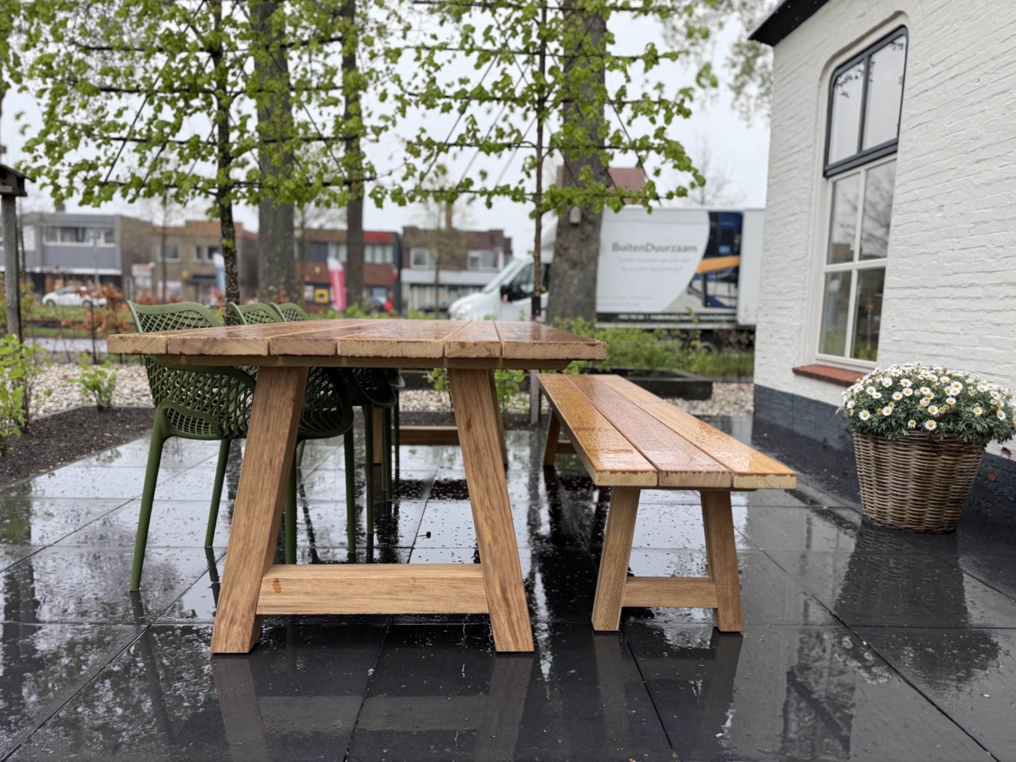 De tafel is volledig vervaardigd uit Iroko hardhout, dus ook het onderstel is van hetzelfde duurzame materiaal. Dat zorgt voor een rustig, natuurlijk totaalbeeld, waarbij blad en poten perfect op elkaar aansluiten. Je hebt de keuze uit verschillende poten die allemaal stevig en stabiel staan. De onderkanten worden voorzien van kunststof dopjes zodat de poten niet in het water staan op je terras. Daarnaast is het hardhout makkelijk schoon te maken en bij te werken, een duurzaam alternatief ten opzichte van stalen poten.