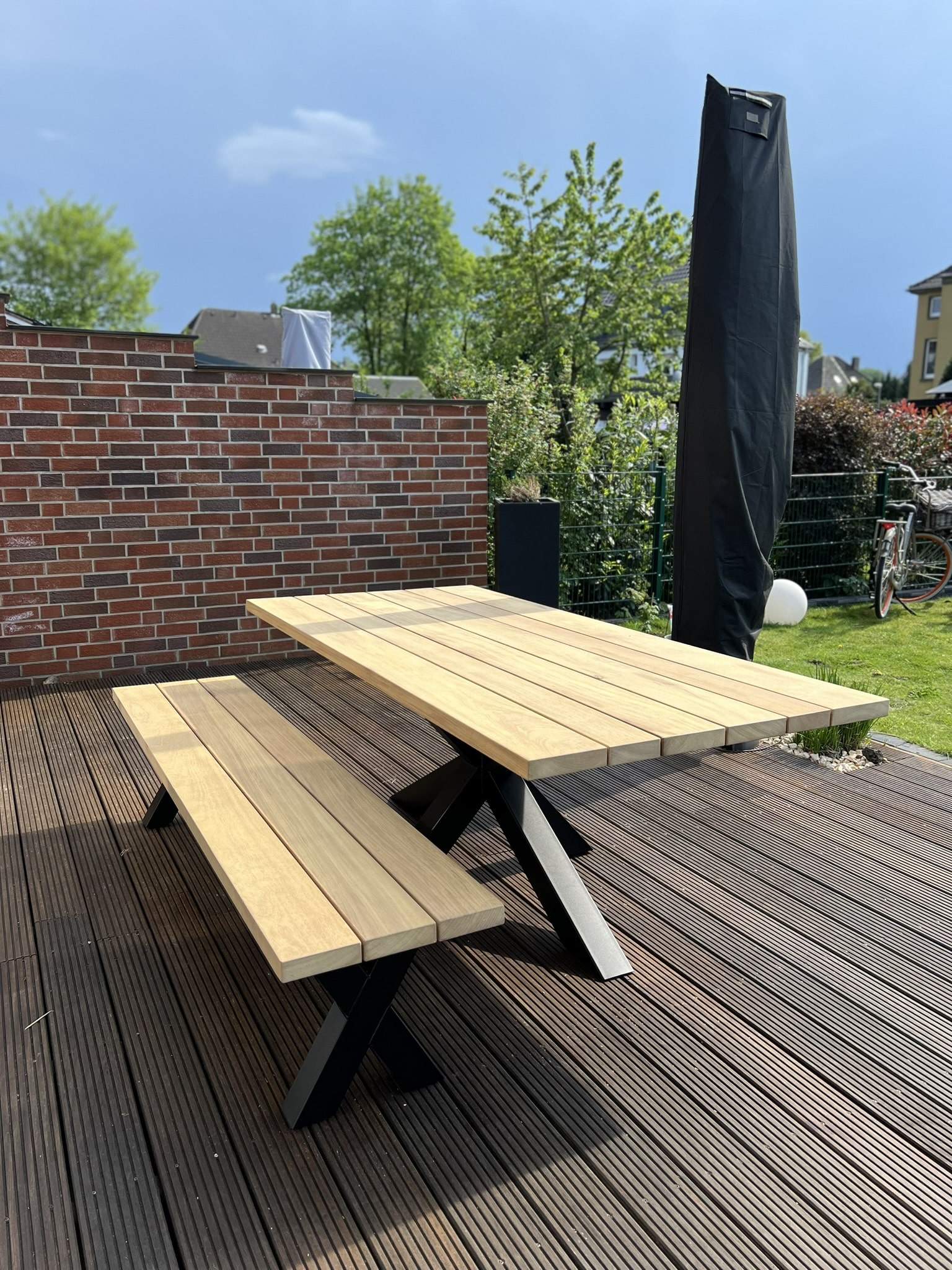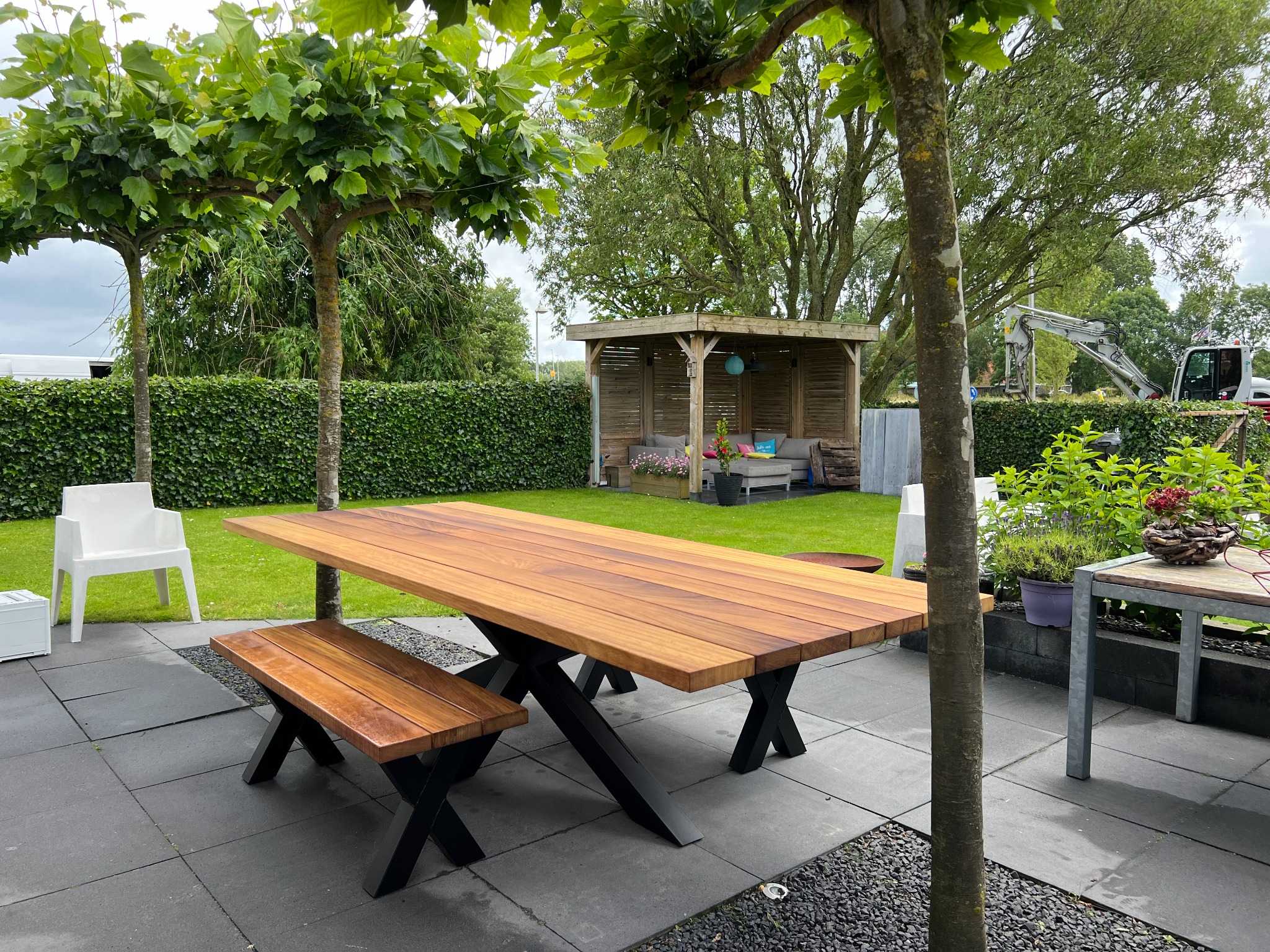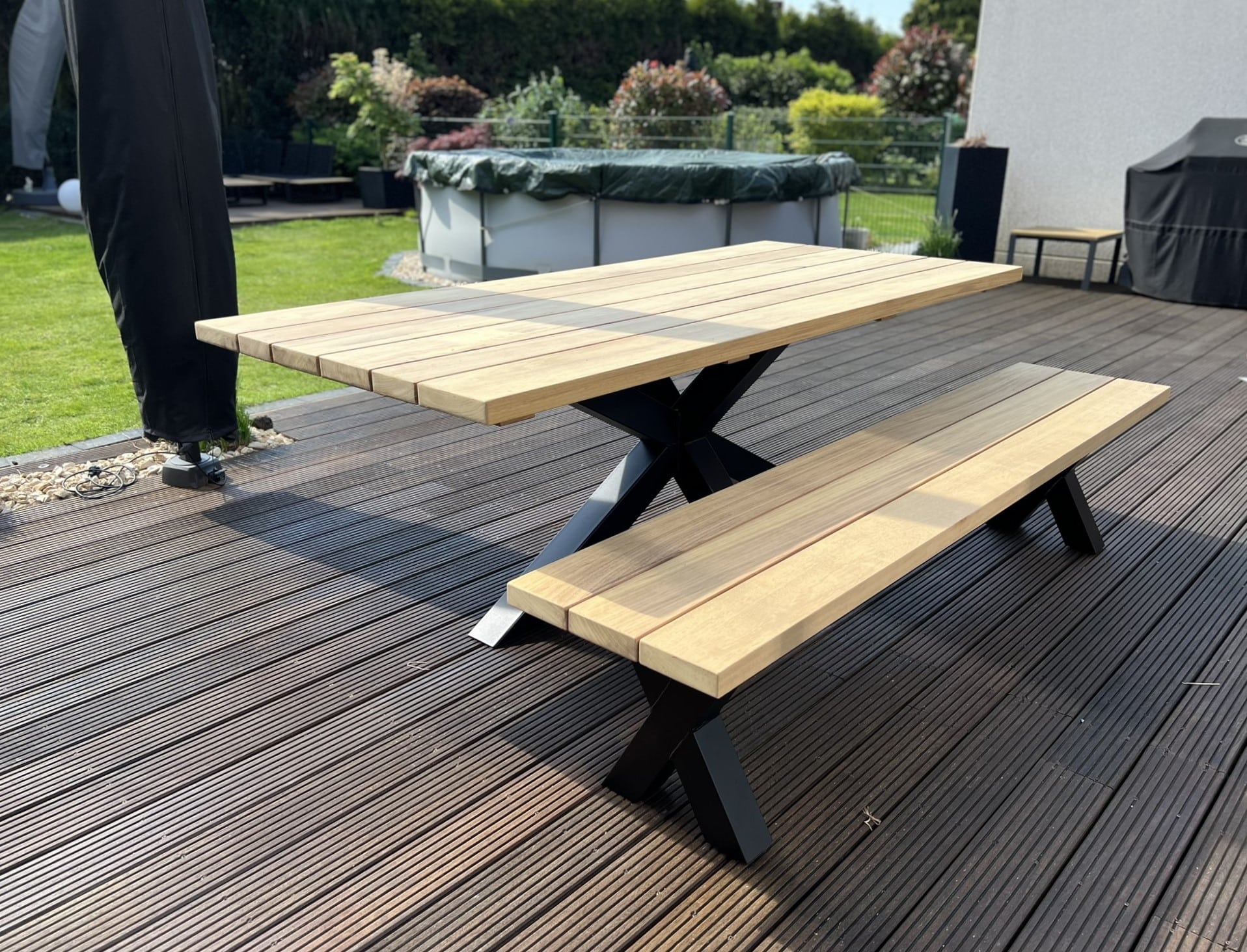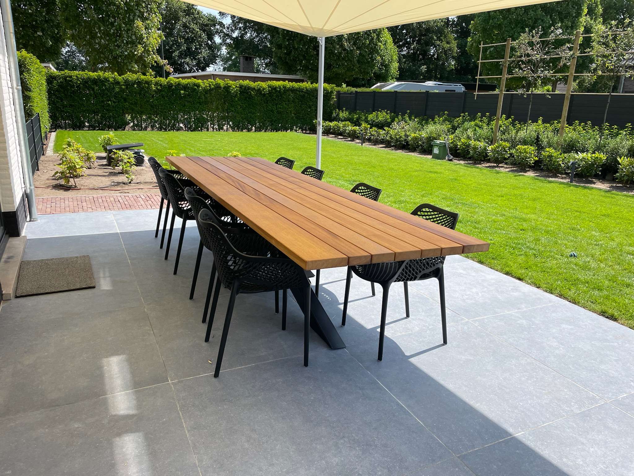 Deze rechthoekige tuintafel van Iroko hardhout met Matrix poot is een stijlvolle en eigentijdse keuze voor buiten. De warme houtkleur van het Iroko blad komt prachtig tot zijn recht in combinatie met het opvallende onderstel. Dankzij de rechthoekige vorm is de tafel praktisch in gebruik en biedt deze veel zitruimte, zowel aan de lange zijden als op de kopse kanten. Door de Matrix poot heb je op de hoek van de tafel geen last van poten. Je kan dus gemakkelijk extra stoelen aanschuiven bij een diner of feestje.