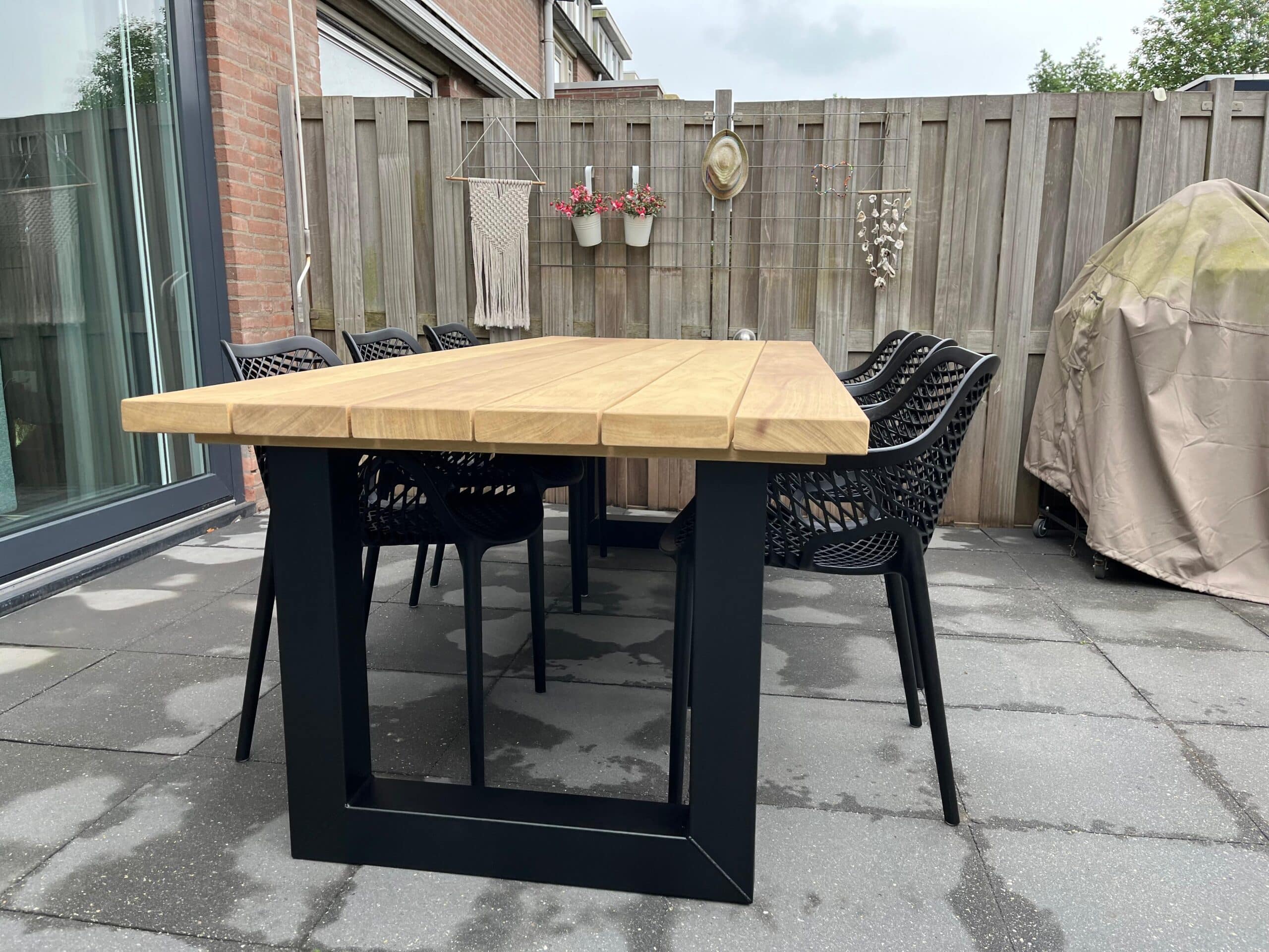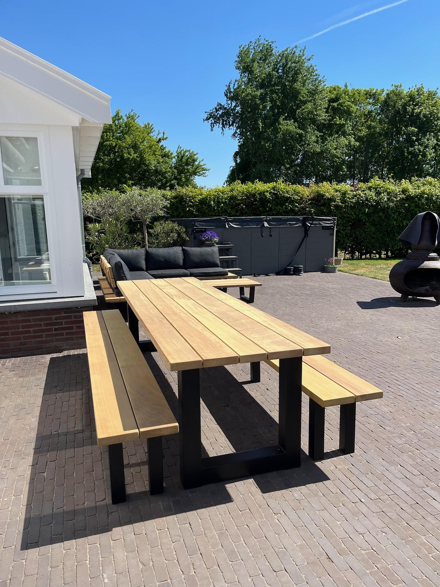 • De balken van de Iroko tafels bestaan uit verschillende maar symmetrische breedtes