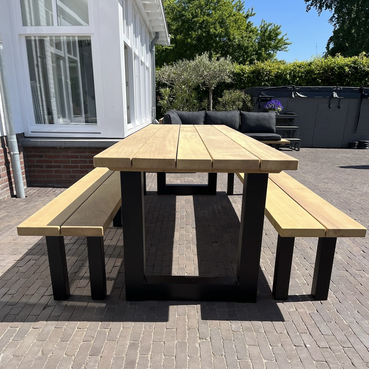 Deze rechthoekige tuintafel van Iroko hardhout met U poten van staal combineert strak design met praktische voordelen. De rechte vorm biedt volop zitruimte, terwijl het U-vormige onderstel zorgt voor stabiliteit en een tijdloze uitstraling. Dankzij de open zijden kan je nog goed extra stoelen plaatsen aan de kop van de tafel. Ideaal voor gezellige diners in de buitenlucht.