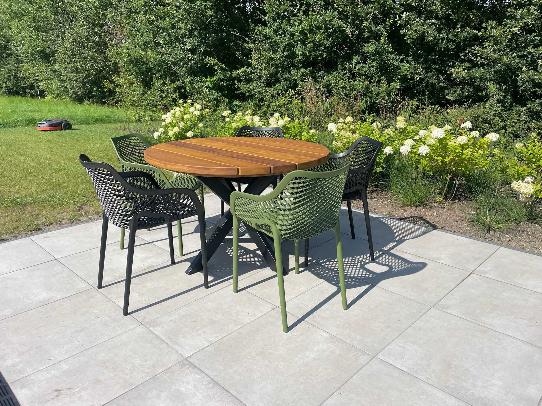 De ronde tuintafel van Iroko hardhout met een stalen Matrix poot is een stijlvolle, duurzame keuze voor wie houdt van comfort en gezelligheid in de tuin. Dankzij de ronde vorm zit iedereen rondom de tafel, wat zorgt voor een intieme en sfeervolle setting. De stalen Matrix poot in het midden geeft de tafel een moderne uitstraling en biedt maximale beenruimte rondom.